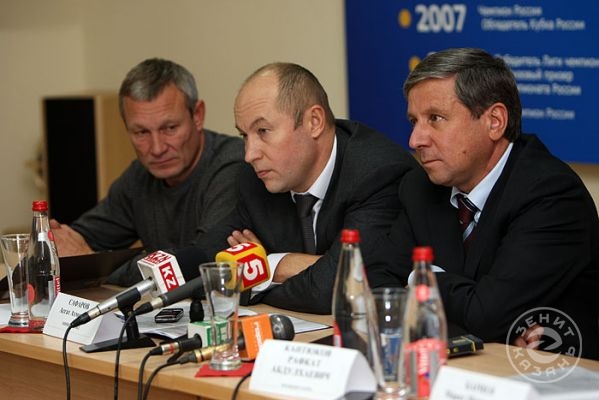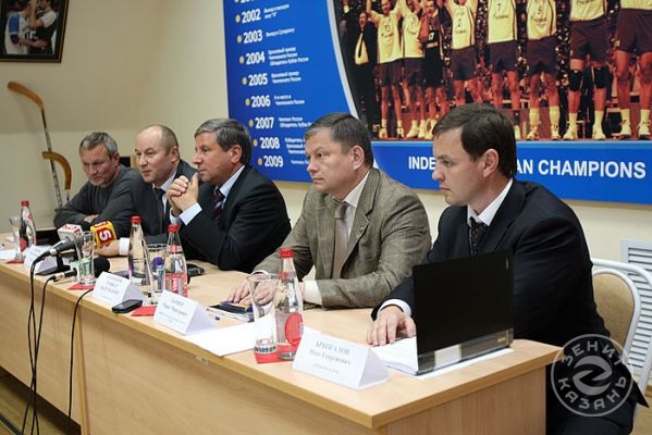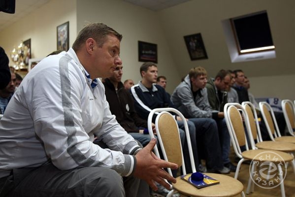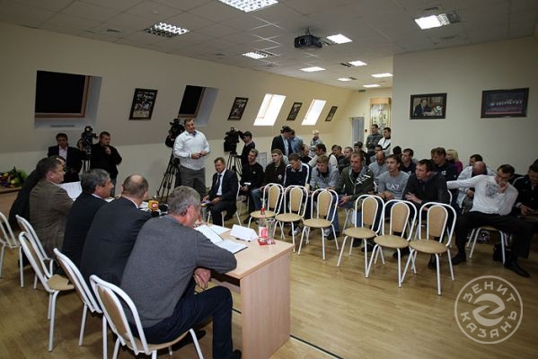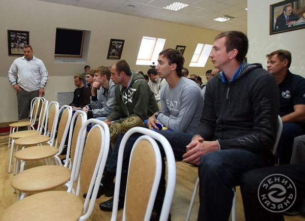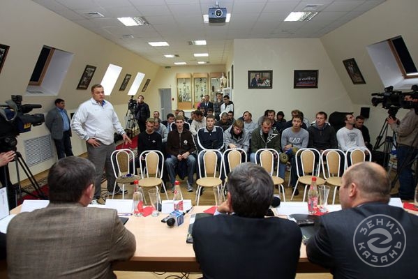 Вчера состоялась встреча игроков и тренерского штаба команды «Зенит-Казань» с руководством клуба. На ней вспомнили самые яркие моменты сезона прошлого, озвучены задачи на сезон грядущий и представлены новички.Перед началом встречи все собравшиеся на экране посмотрели клип с самими яркими моментами прошлого, триумфального для казанской команды, чемпионата России. Вот Черемисин забивает победный мяч, вот качают Алекно, а вот в раздевалке команда обливает шампанским Богомолова…